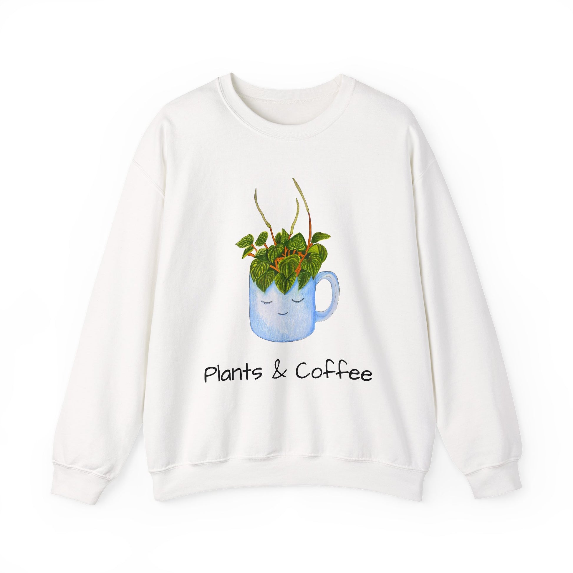 Cute sweatshirt featuring a plant in a mug with 'plants and coffee' text. This cozy sweatshirt is perfect for plant lovers who enjoy sipping coffee while tending to their green friends. It's a great choice for the colder months and adds a touch of charm to your casual wardrobe. Ideal for casual days at home, coffee shop outings, or even plant-themed gatherings and events.